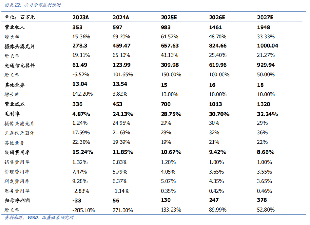 毛利率:1)摄像头滤光片:我们预计该业务板块毛利率将趋于稳定,假设2025-2027年毛利率分别为29%/30%/29%。2)光通信元器件:公司凭借其行业地位及技术先发优势与其客户保持深度合作,且未来伴随光隔离器占比增加,我们预计未来业务毛利率将提升,假设2025-2027年分别为28%/32%/36%。3)其他业务:我们预计公司其他业务毛利率较为稳定,假设2025-2027年分别为19%/21%/22%。