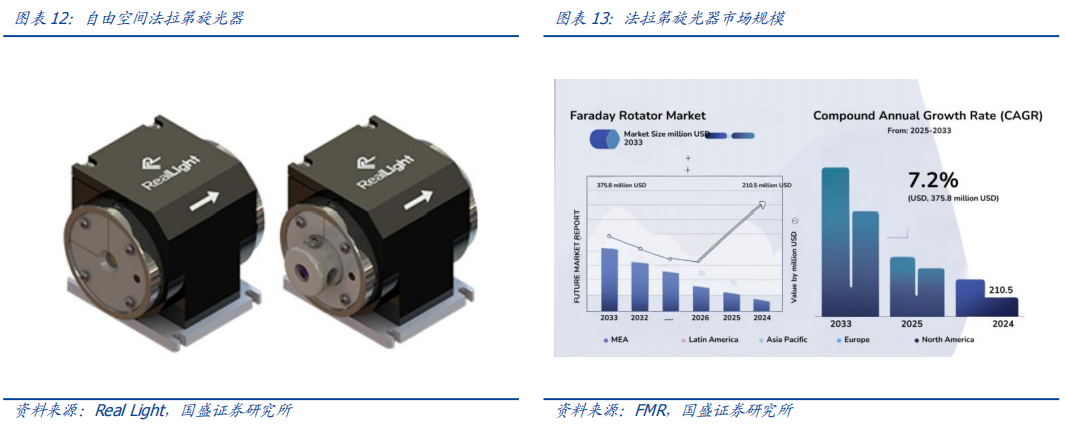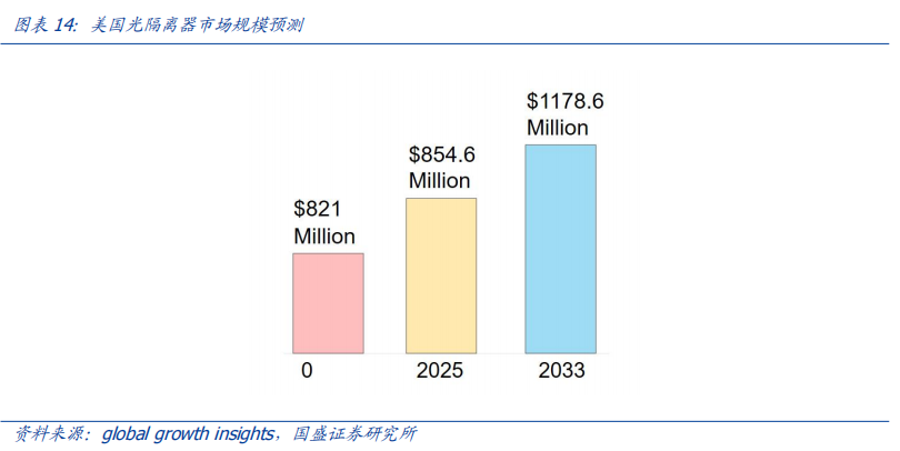 高需求下光隔离器未来前景广阔。从应用场景看,政策与AI发展趋势共振驱动数据中心向高密度、多通道、高速率方向加速演进,对上游光隔离器等光器件需求增加;而由于上游原材料如法拉第旋光片等限制,布局此领域企业有望凭借其稀缺性、充足的产能与技术壁垒构建优势,在受益于市场需求增加的同时享受涨价逻辑。根据第三方机构global growth insights预测,美国光隔离器市场规模将从2025年的8.5亿美元增长到2033的11.8亿美元,年复合增长率为4.1%。