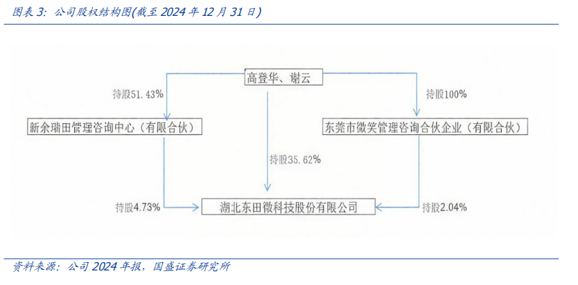 公司股权结构较为集中。公司实控人为高登华和谢云,截至2024年12月31日,高登华持有20.2%股份,谢云持有15.5%股份,并通过新余瑞田管理咨询中心(有限合伙)间接持有2.4%股份、通过东莞市微笑管理咨询合伙企业(有限合伙)间接持有2%股份,总持股比例为40.1%。