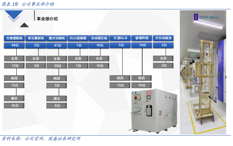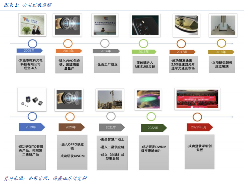 东田微专业从事光学薄膜、光学玻璃成型的开发及应用。公司拥有1300名员工,产品涉及手机、5G基站、数据中心、5G通讯、光纤入户、安防、车载、智慧座舱、无人驾驶、激光雷达等多领域 。公司拥有先进的镀膜设备,如:德国莱宝Helios800、日本Optorun、新加坡NanoFilm等,可实现紫外、可见光、近红外、远红外等截止滤光片以及最小0.8nm带宽的极窄带滤光片、超硬金属膜等薄膜的制造。东田微2009年以东莞市微科光电科技有限公司起步,6人开启征程 ;2012年进入VIVO供应链实现蓝玻璃批量量产,2014年昆山工厂成立拓展布局;2016年蓝玻璃进入MEIZU供应链,2017年研发通讯2.5G低通滤光片进军光通讯;2018年立项研究超强度蓝玻璃,2019年研发TO管帽类拓展产品;2020年进入OPPO供应链且研发CWDM,2021年南昌智慧厂动土、进入三星供应链并成立成型事业部;2022年研发DWDM极窄带滤光片,同年5月成功登录深圳创业板,一步步从初创迈向多元布局、上市发展的阶段。