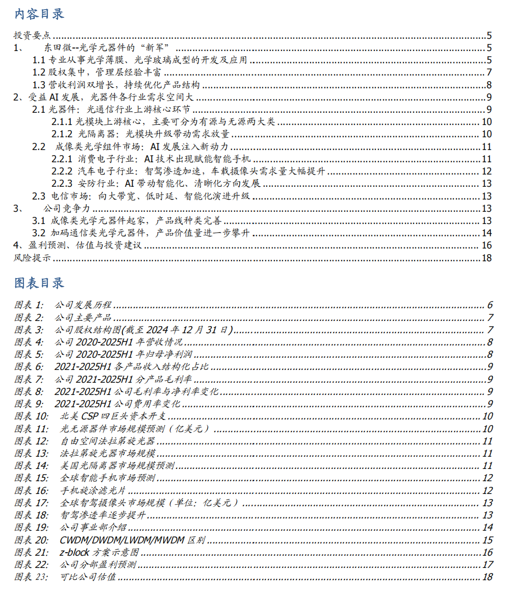 光通信正全面迈入高速率、集成化与低功耗的新阶段。800G光模块已步入规模商用,1.6T技术正加速突破,CPO和硅光方案持续推进功耗革命,对光学元件的性能、精度和集成能力提出了更高要求。在这一背景下,我们重点关注能够为高速光模块提供核心光学元件的供应商,这也正是我们推荐东田微的关键出发点。