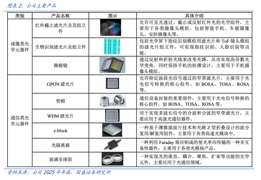 通信类光学器件品类布局不断完善。2017年,公司依托光学镀膜工艺技术积累,研发并量产 GPON 滤光片,进入光通信元件领域,至2025年上半年公司已形成品类覆盖完善的光学元器件矩阵,包括应用于接入网传输设备的各类 GPON 滤光片、TO 管帽,应用于波分复用器件的 WDM 滤光片及组件,如 CWDM/DWDM/LWDM/MWDM/CCWDM、z-block 组件,以及应用于光模块的光隔离器组件等: