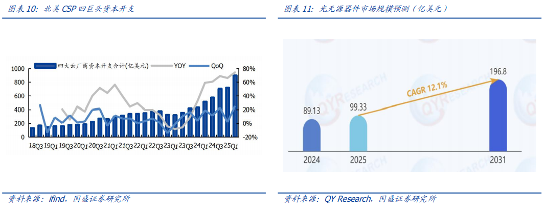 受益于AI发展,光器件将保持高行业景气度。伴随云计算以及AI迅速发展,全球数据流量呈爆发增长,AI叙事逐渐进入应用突破、需求爆发阶段。从Capex角度看,2025年海外CSP四大巨头与国内阿里巴巴、字节跳动等互联网头部企业资本开支持续超预期,计算集群从十万卡到百万卡演进, NVL72等高性能机柜的出货持续印证高速率光模块需求。我们认为,光器件为光通信和光模块必不可少组成部分,随着光通信行业的发展和应用场景的变化,光器件行业将加速发展,一是AI基础设施快速建设导致光模块上游需求量增加,二是供给方面目前处于短缺状态,稀缺标的有望在受益于需求的同时享受涨价逻辑。根据QY Research预测,光无源器件市场预计将在2025至2031年间以12.1%的年复合增长率(CAGR)增长,市场规模将从2024年的约89.1亿美元增至2031年的196.8亿美元。