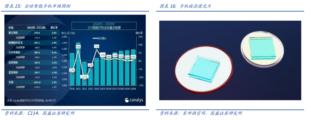 智能手机影像技术创新,带动光学元件持续升级。潜望式镜头可在保持手机轻薄的同时大幅提高远摄能力,相比于普通光学变焦倍数更大、成像效果更优,是智能手机重要的光学创新方向。相较于普通镜头,潜望式镜头新增了棱镜模块,其单位价值高、技术门槛高、市场渗透率低,为摄像头光学元件市场带来增量市场空间。另外,旋涂滤光片采用半导体旋涂工艺,能有效抑制红光Flare、鬼影,减少算法误判,大幅提升成像质量,未来将从高端旗舰手机逐步向中低端手机渗透,从主摄应用拓展至超广角、长焦摄像头,市场需求也有望进一步增加。