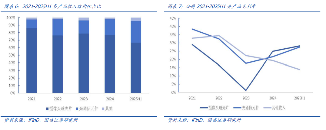 通信类光学元器件业绩迅速增长。分业务板块来看,2024年公司成像类光学元器件产品实现收入 4.6亿元,同比增长 65.1%;2025年H1成像类光学元器件实现营业收入 2.5亿元,同比增长 22.5%。2024 年通信类光学元器件产品收入 1.2亿元,同比大幅增长 101.7%,主要系公司不断加强客户开发,主要产品 GPON 滤光片、管帽出货量均大幅增加;另一方面则受益于新产品销售带来的业绩增量,如用于高速光模块的 WDM 滤光片、激光雷达光学元器件、光隔离器等均已实现批量出货。2025年H1公司通信类光学元器件实现营业收入1.1亿元,同比增长 113.7%,成功实现从电信市场向数通市场的重要拓展。
