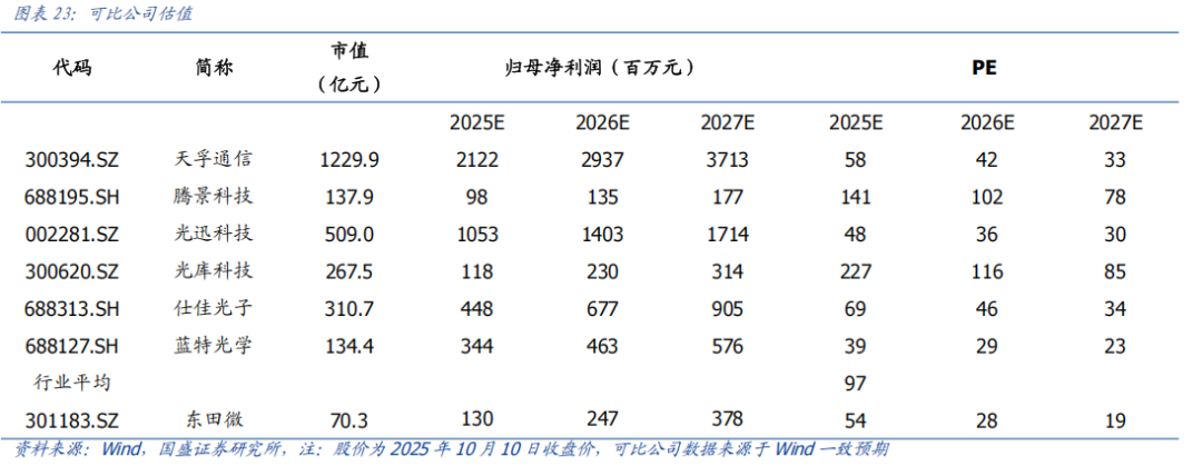 我们选取6家以光通信行业为主业的上市公司进行比较,2025年行业平均PE为97x,鉴于公司较好的业务发展前景,WDM滤光片、光隔离器将为公司提供较高盈利增速,2025/2026/2027年归母净利润1.3/2.5/3.8亿元,对应2025/2026/2027年PE分别为54/28/19倍,我们认为未来光通信技术演进将为公司业绩提供增量空间,首次覆盖给予“买入”评级。