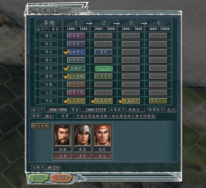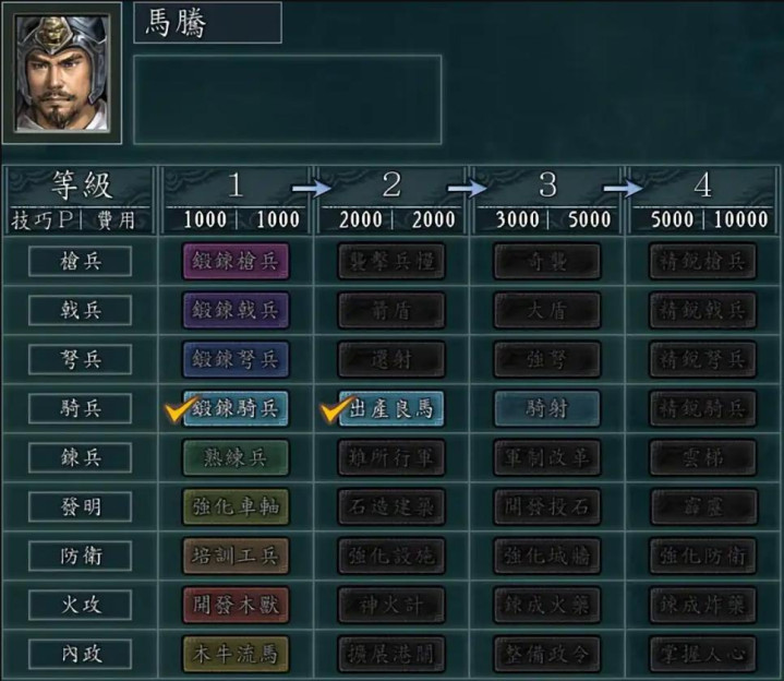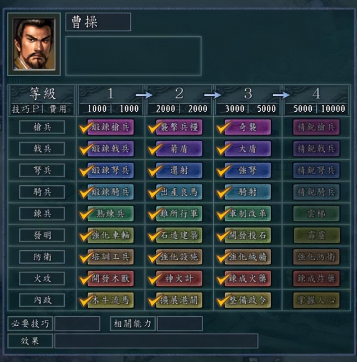其中“熟练兵”能为武将提升10点武力经验,“难所行军”可提升20点,“军制改革”能增加30点,最高级的“云梯”更是直接给出50点武力经验。而且这些技巧的研究周期并不算长,只要在都市里建造了人才府,4个等级的技巧分别只需10天、20天、40天和70天就能完成,平均下来每个回合能为武将提升7-10点武力经验,长期积累下来,效果相当可观。